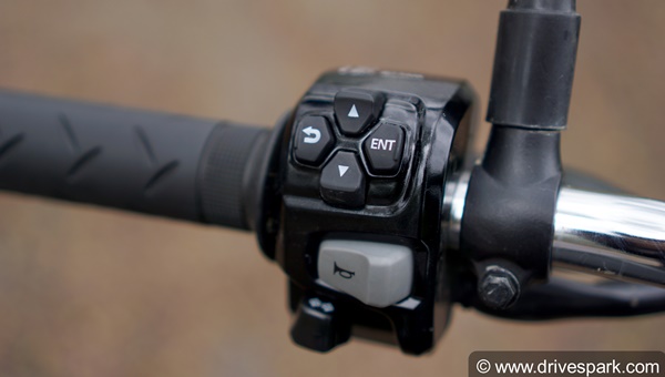 Moving away from the instrument cluster to the handlebars and we can see the different arrows and enter buttons present on the left side. These buttons allow for quick shuffling between the different information displayed on the small screen on the instrument pod.