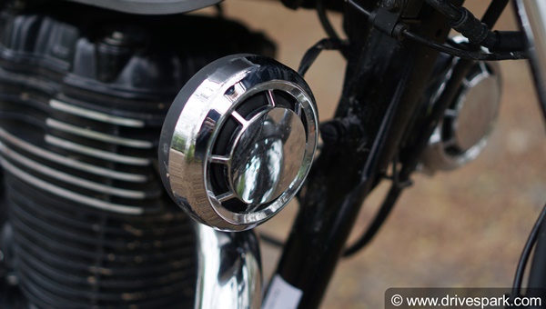 Below the instrument cluster, the Honda H'ness CB 350 features dual horns, again covered in chrome. The dual-horn is present only on the top-spec 'DLX Pro' variant, with the base model receiving just a single-horn.