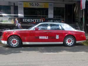 Mobile Store is offering free rides to passers-by. Rumours say Rolls-Royce had objected to the use of the Phantom as a publicity tool by Mobile Store. This is surprising as it is the prerogative of the car owner to use the car as he deems fit. More over Mobile Store is actually offering Rolls-Royce greater publicity and visibility than its own publicity campaigns. The only thing objectionable about the car is the odd colour combination of red and white.