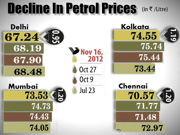Petrol prices have been cut by 95 paise effective from Thursday, 15th November. The new petrol prices were cut following a drop in international crude prices. Oil companies had previously reduced petrol prices by 56 paise on October 9.