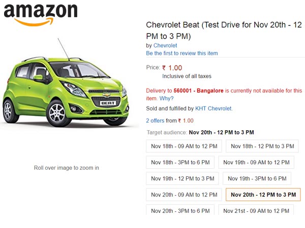 This is the very first time an automobile manufacturer will be offering test drive via an e-commerce website. Amazon and Chevrolet are redefining the automobile experience in the Indian market. Currently, Amazon and Chevrolet will offer this service in Bengaluru and Chennai followed by Delhi, and Mumbai.
