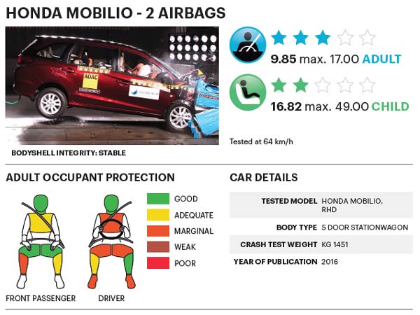 The variant with the dual airbags at the front of the Honda Mobilio scored three-stars from the Global NCAP for adult occupant protection. Global NCAP's observation was that the protection for the driver and the passenger's head and necks were good.