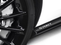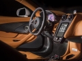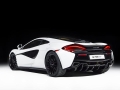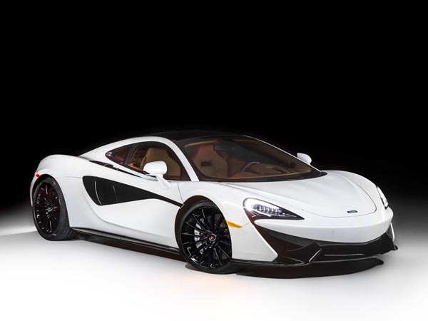 The exterior of the McLaren 570GT concept receives an Elite Pearl White paint job. A deep gloss black paint has been used to highlight the wheels, side skirt, door inserts, front, and rear-end of the supercar. The interior receives premium saddle tan leather upholstery with carbon fibre inserts.