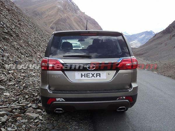 Tata Hexa features a black cladding, projector headlamps, side sills, and roof rails. The exterior also features twin chrome exhausts and chrome accents.