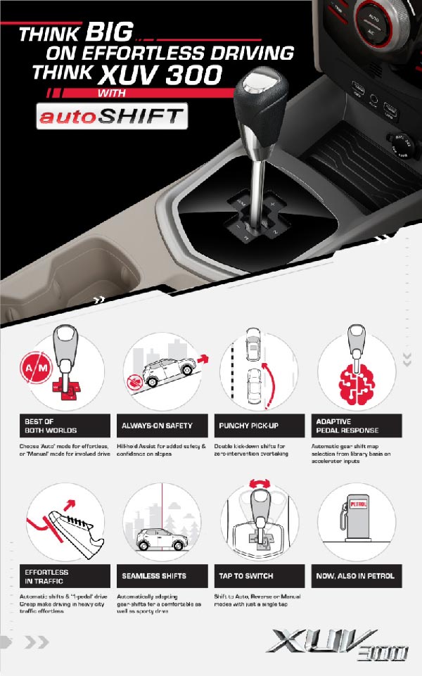 To reiterate, the Mahindra XUV300 is powered by a 1.2-litre petrol engine. It produces 108bhp and 200Nm of peak torque. It is mated to either a six-speed manual or the new autoSHIFT transmission option.