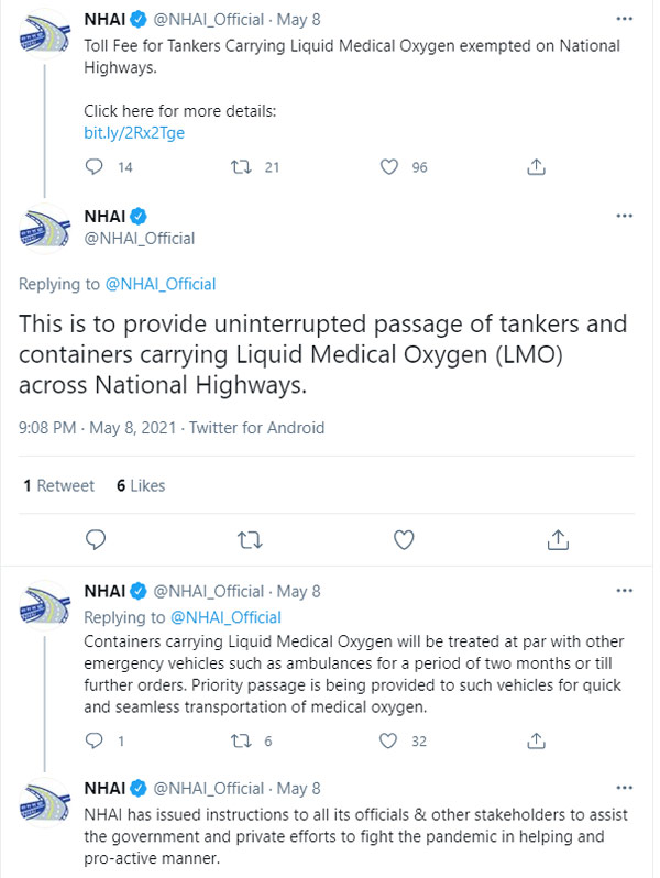 National Highways Authority of India said in an official statement, "To provide uninterrupted passage for tankers and containers carrying Liquid Medical Oxygen (LMO) across national highways, the user fee for such vehicles at toll plazas has been exempted. Although toll plazas have nearly zero waiting time after implementation of FASTag, NHAI is already providing priority passage to such vehicles for fast and seamless transportation of medical oxygen."