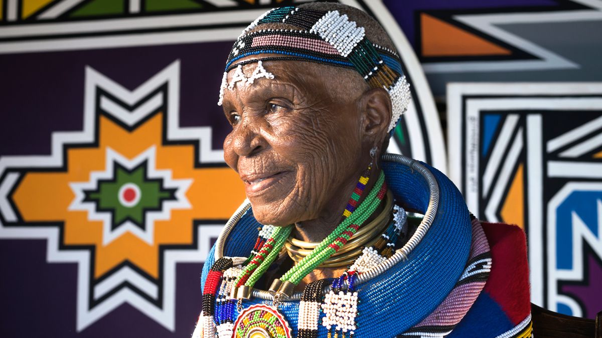 Esther Mahlangu, born in 1935 in South Africa, has been creating large-scale works for over eight decades. She learned traditional Ndebele painting techniques from her family at age ten. Her art involves using natural pigments on structures in her village and acrylics on canvas for varied scales and colours.