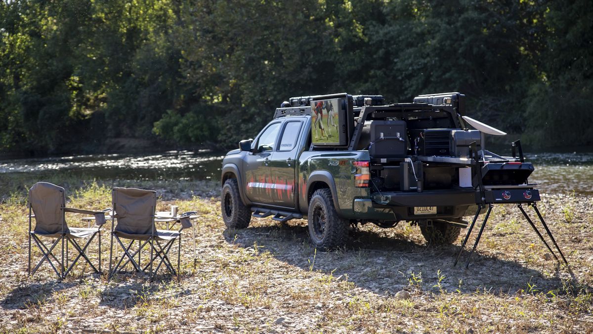 The Project Trailgater is equipped with twin 43-inch TVs and a soundbar mounted on a NISMO Off Road overlanding rack. This setup allows fans to enjoy games outdoors during football season. A folding solar panel, custom lithium battery pack, and Starlink connection enable streaming almost anywhere.