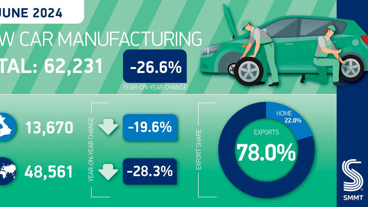 UK car production decreased by 7.6% in the first half of 2024, according to the Society of Motor Manufacturers and Traders (SMMT). Factories produced 416,074 units, which is 34,094 fewer than the same period in 2023. This decline followed a significant drop of 26.6% in June due to multiple model changes.