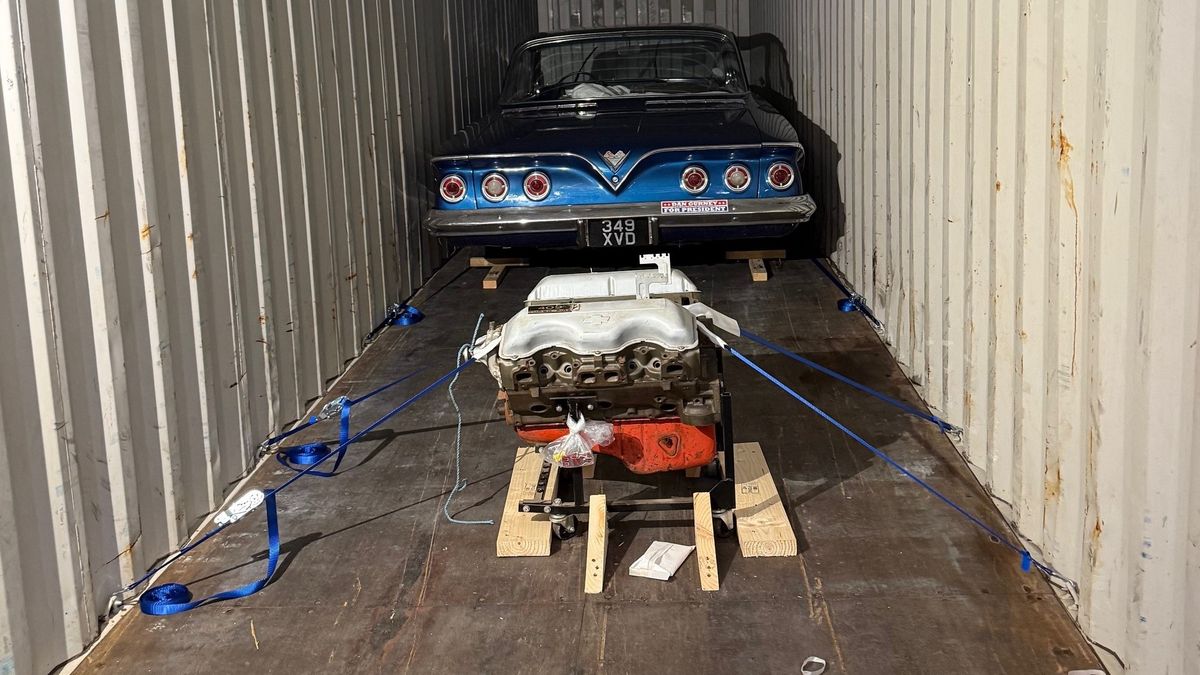 The original 409 engine of the Impala was lost but later found inside a boat. When Justin decided to purchase the car, he discovered this engine had matching numbers. The vehicle arrived in Los Angeles after traveling through several countries, including Scotland and Canada.