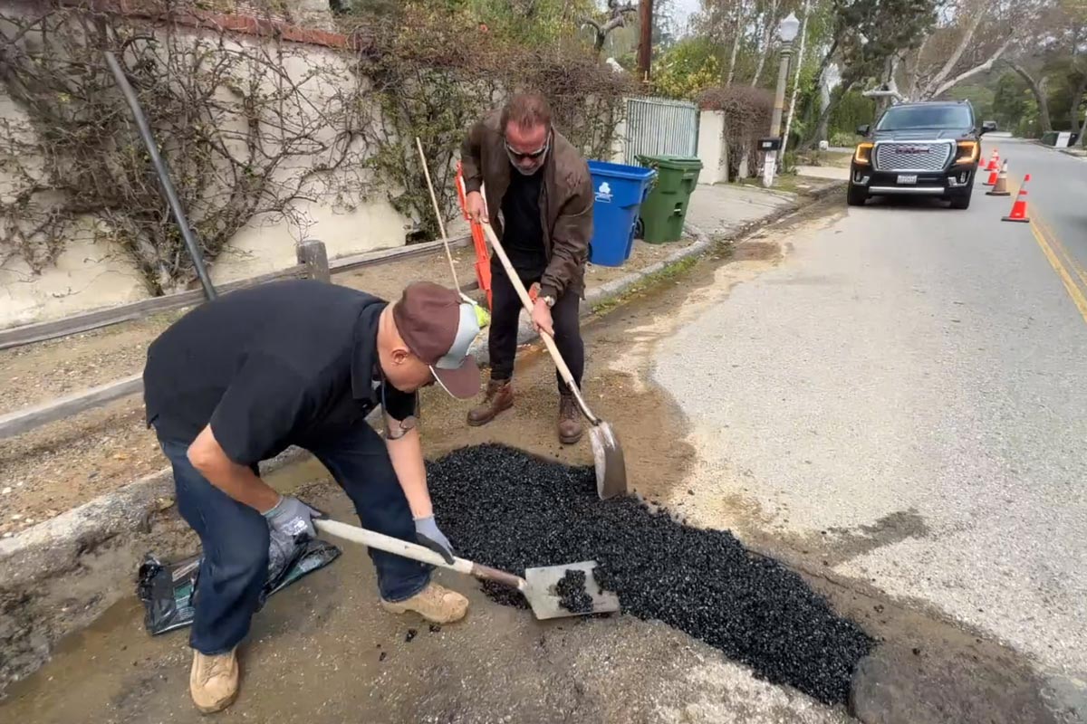 Former California Governor, Hollwood megastar and all-around motoring icon, Arnold Schwarzenegger took to the streets in Los Angeles to fix a large pothole that had been causing problems for motorists and cyclists in the neighbourhood for weeks.