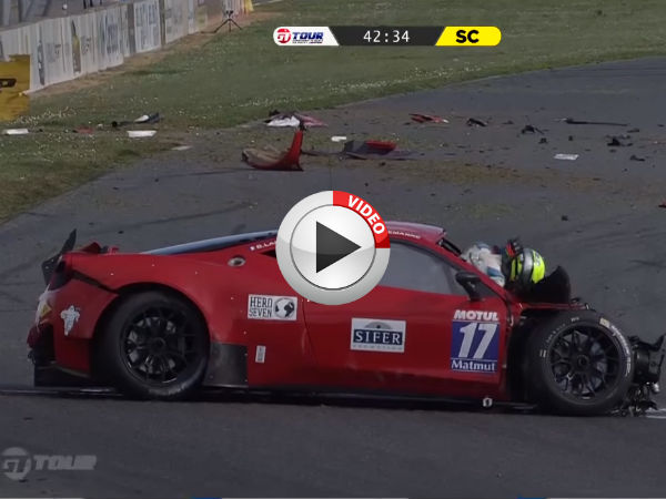 Sacha Bottemanne, a GT Tour driver was driving his Ferrari 458 GT3 race car when he decide to nudge another Ferrari out of his way. Unfortunately for him, his car spun and smashed into the walls on the side of the Nogaro race track in France.