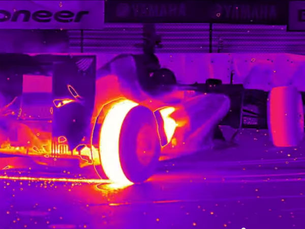 The video is actually simple and has been shot using an infrared sensor. This shows cold and hot spots on the subject, blue is for cold and red means hot. The Formula One car performing donuts looks spectacular, when shot in infrared mode.