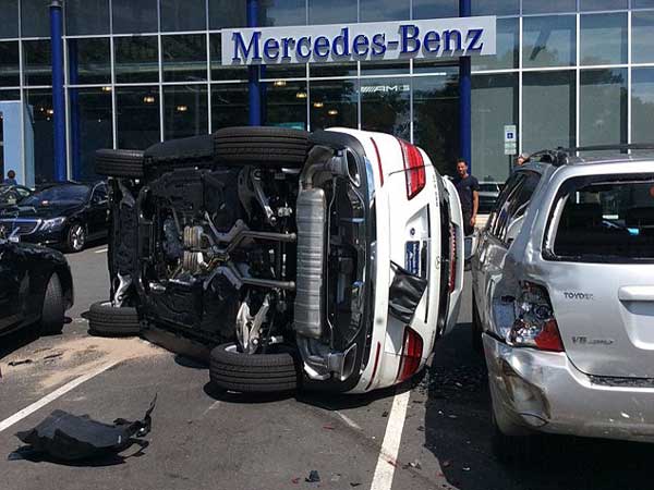 A woman who took a brand new Mercedes for a test drive, crashed just six seconds after starting. The car crashed into other cars parked and finally flipped to its side before coming to stand still.
