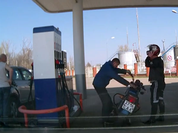 They somehow manage to move out of the gas station and surprisingly the rider is not wearing a helmet, but the pillion is. They drop their bike several times before leaving with great difficulty.