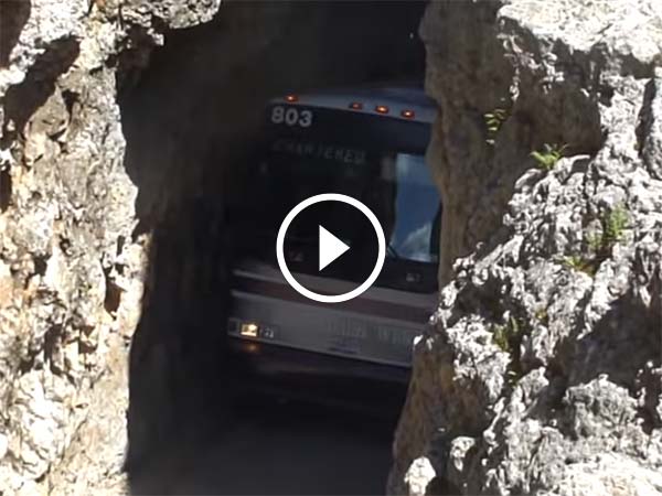 The YouTuber, 'fortnighte', who shot the video, perched upon the rock films the bus passing through one of the narrowest rock tunnels. This is pass is on the Needles Highway in the U.S. state of South Dakota.