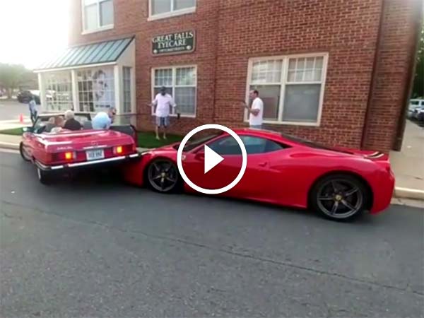 Unfortunately for the driver of a rare Ferrari 458 Speciale, an old lady in an old Mercedes 380 SL roadster reversed onto the bonnet of his car while trying to parallel park.