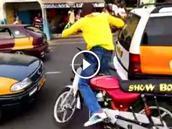 Crazy biker performs stunts on the roads of Africa creating a nuisance for the traffic.