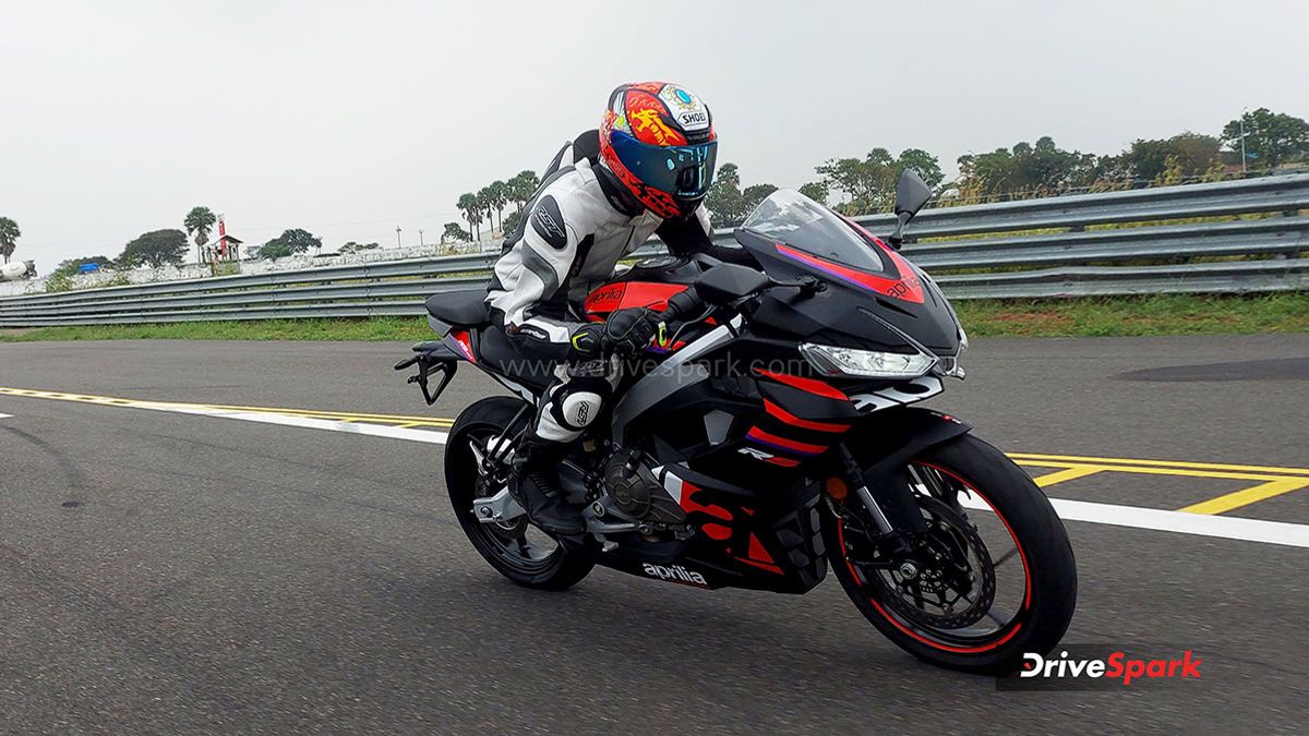 This motorcycle is inspired by the larger RS 660 model and is manufactured in Baramati, Maharashtra. Built on a twin-spar aluminium frame, it features disc brakes measuring 320 mm at the front and 220 mm at the rear, complemented by dual-channel ABS for enhanced safety.