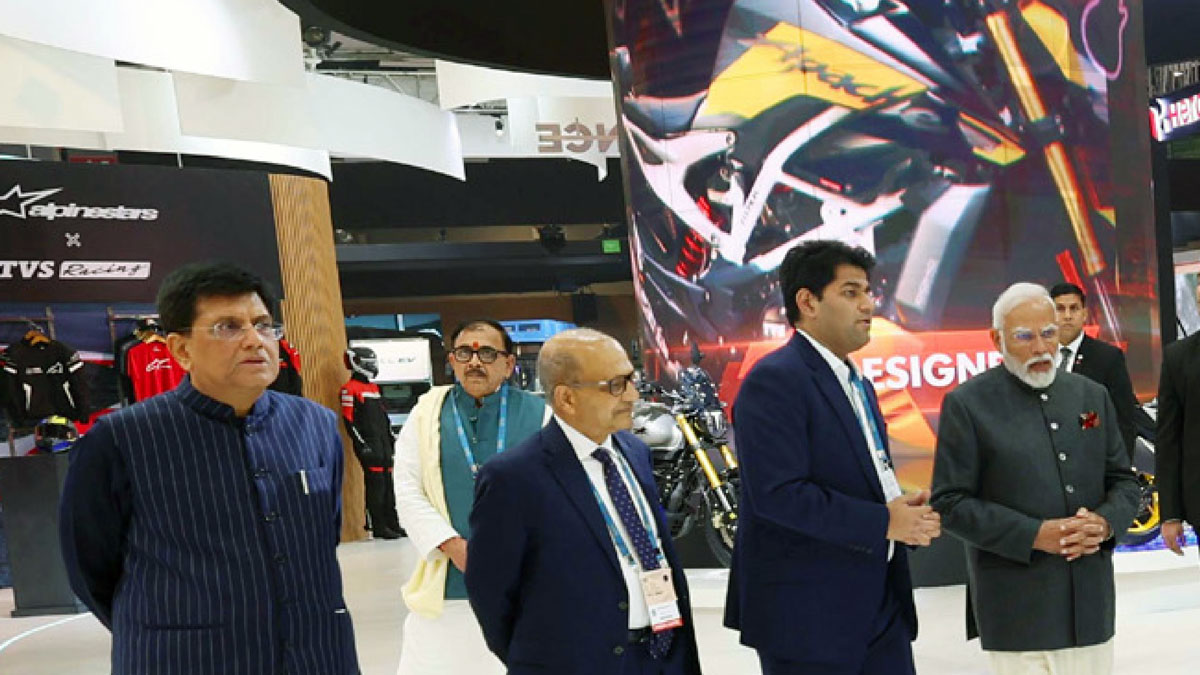Prime Minister Modi and Minister of Commerce, Piyush Goel stopped by the TVS Pavilion at Bharat Mobility Global Expo 2024 where they inspected the offerings on stage that were showcased by the Chennai-based two-wheeler manufacturer.