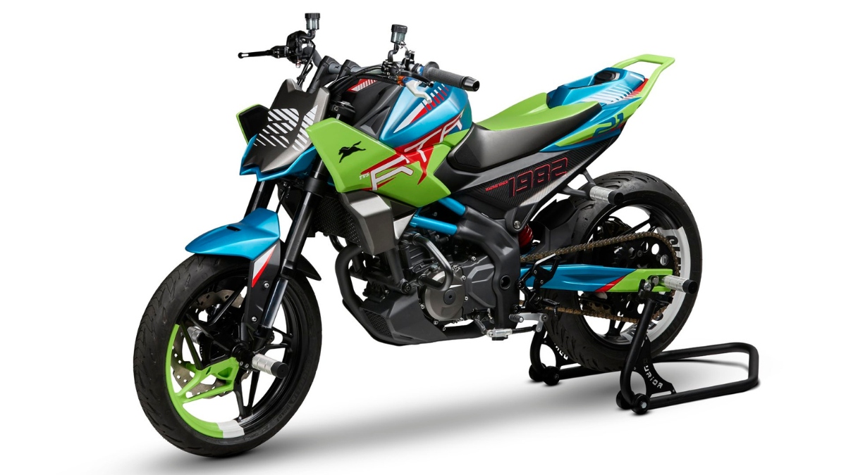 It is a sporty naked motorcycle featuring wide handlebars, a sleek tail section, a sharp overall design, and a single-seat setup. The bike did not feature a headlamp, mirrors, or a rear seat, making it look more like a purpose-built stunt bike rather than a conventional naked sports motorcycle.